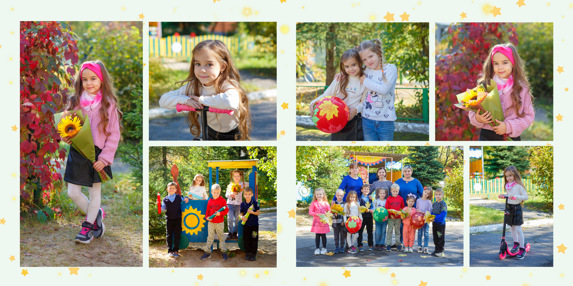 Крупный портрет вашего ребенка в рамочке из портретов всех детей группы с фамилиями.